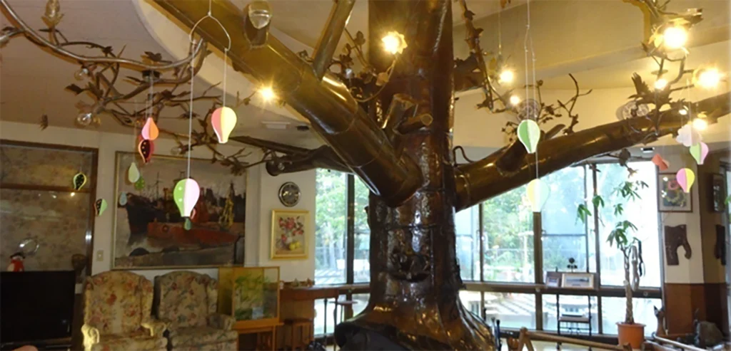 生命・長寿のシンボル、縄文杉をイメージし、旭ヶ岡の家の創設者であるグロード神父が「木の中で木を燃やす」というアイディアを発信、七飯の琢磨工房の木村裕之先生がデザインして手作りした暖炉です。暖炉の受けの部分は日本の昔の釜をイメージして作ったそうです。猫の首に鈴をかけようと、そっと近づこうとしているネズミがいますが、このネズミはメガネをかけてパイプをくわえています。恐らくグロード神父をイメージして作られたものと推測されますが、そのネズミもまた、上から狙われています。このように、旭ヶ岡の家の中には入居者を退屈させない、面白い仕掛けがたくさん隠れています。